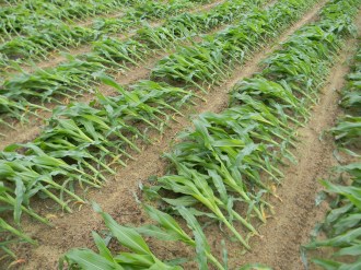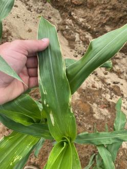 The current crop looks good across the state so when a problem or symptoms of problems show up, it seems to stand out. A couple of weeks ago, I was seeing the results of some of the very cold nights and warm days on the growth of corn. It is not unusual to see leaves coming out of the whorl that are yellow due to “locking in the whorl” ( A bad descriptive term on my part). During cooler temps, leaves are slower to emerge out of the whorl and unfold which causes yellowing. It may also cause “goose-necking” of the plant which can be mistaken for herbicide damage. Be careful in diagnosing environmental problems as it can lead to false conclusions. Just recently, a consultant sent a picture where a grower sprayed a combinations of herbicides, one which included a bleaching herbicide just prior to colder, wet conditions. A lot of times, when environmental stress occurs, the plant has greater difficulty in metabolizing the herbicide. In these cases, symptoms will show up in some of the plants (pic on the right). One other symptom that I am certainly seeing a lot of is the damage caused by broadcasting fertilizer over the top of corn particularly urea or potash. In these cases, fertilizer falls into the whorl or in between emerging leaves and causes burn. If this is a common practice for you and you have irrigation, I would certainly turn the pivot on immediately after leaving the field to melt or wash the fertilizer out of the whorl or off the plant to reduce the burn effects from the salt. IF you don’t have irrigation or do not choose to apply a little water, then expect to see leaf damage in a week or so