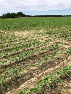 Speaking of wind damage, corn from emergence to about V7 will easily recover (unless it is a root problem). It takes a little while the older it gets but I’ve seen little lasting results. However, if wind damage occurs further along the growth curve (+V10-VT) then more lasting damage results such as green snap, or severe “goose necking”. Here again, do the best you can with your management. I will admit under the severest circumstances with good growth, pivots have actually turned over climbing up tangled corn. Yes, that actually happens. I recall several years ago, it happened twice in one field. Given the storms that have occurred lately, I expect to see a little more of this in Georgia. In the case of the this picture, the field has been well managed and growing rapidly. It will recover in due time and should produce a very good crop.