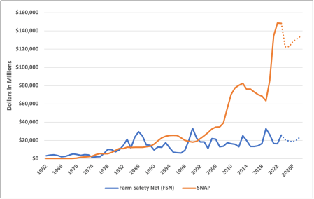 - For 40 years, spending on the Supplemental Nutrition Assistance Program (SNAP) and the farm safety net were roughly equivalent.[1] Remarkably, over the 40-year period from 1962 to 2001, SNAP spending edged out farm safety net spending by just 2/10ths of 1 percent ($439.28 billion versus $438.39 billion). Interestingly, the House was controlled by Democrats for 33 of those 40 years.